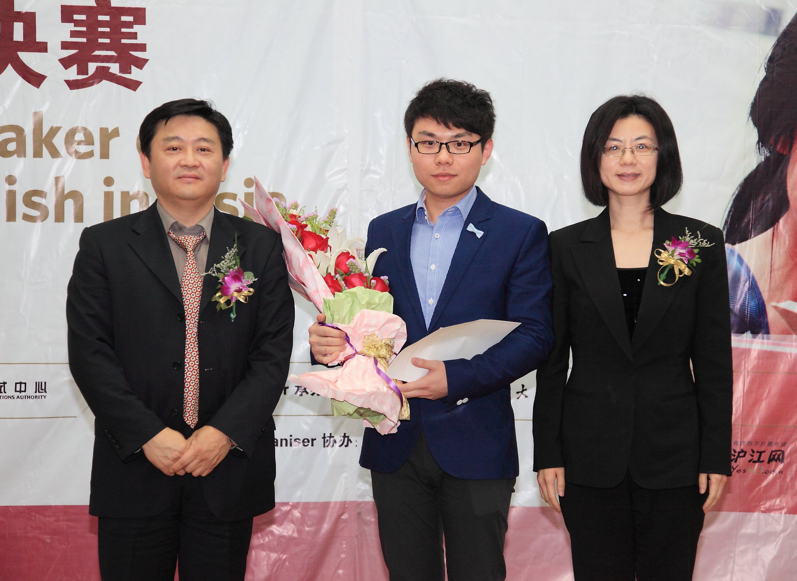 教育部考试中心海外处处长张进与剑桥大学外语考试部驻中国总代表何梅子为大赛冠军魏峰颁奖