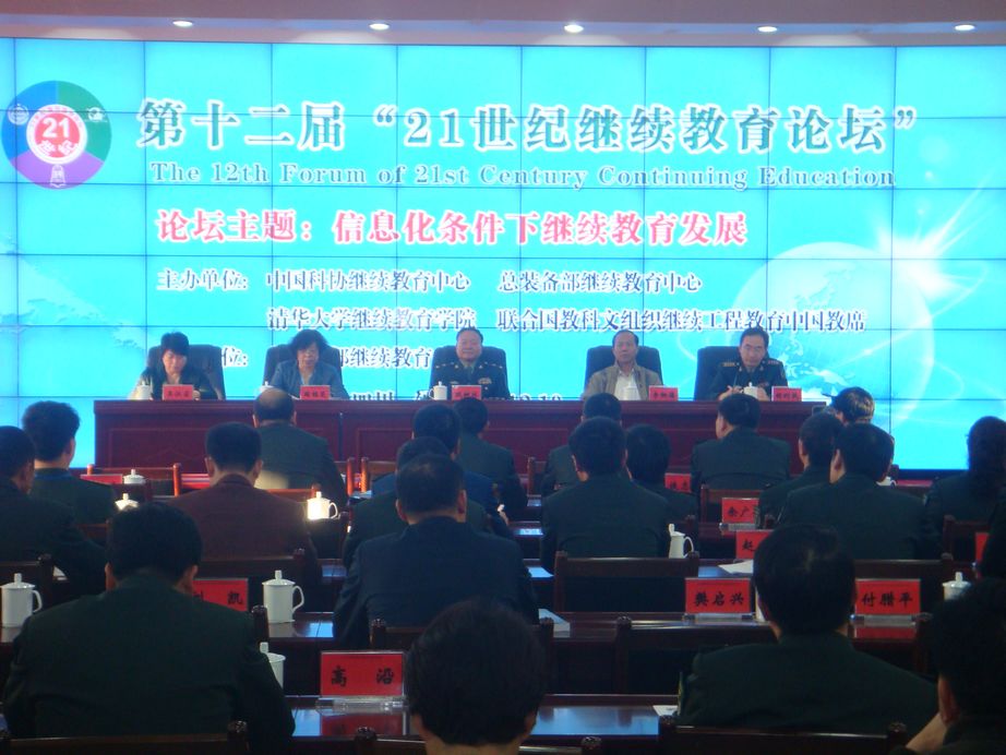 10月23~27日,由中国人民解放军总装备部继续教育中心、中国科协继续教育中心、清华大学继续教育学院、联合国教科文组织继续工程教育中国教席联合主办的第十二届21世纪继续教育论坛在四川绵阳市隆重开幕。来自全国科协系统、各高等院校继续教育学院、社会教育培训机构的管理者,部队及军队院校主管继续教育的负责人,企业人力资源部门主管、政府机关所属教育培训机构管理者150余人参加论坛。论坛开幕式由总装备部继续教育中心主任胡利民大校主持,装备学院政委巩树林少将在开幕式上致辞。