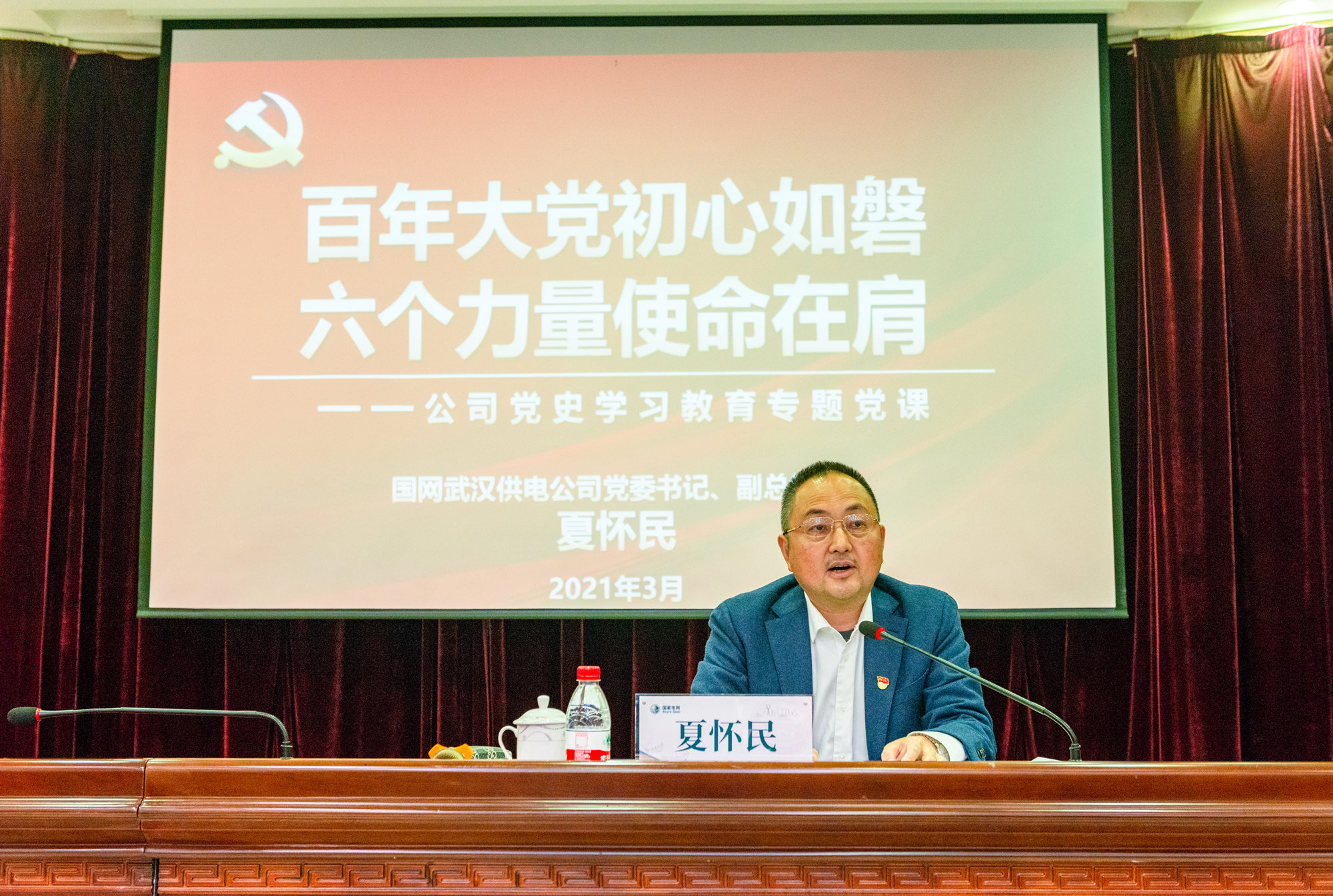 公司党委书记夏怀民结合武汉电力事业发展史,以《百年大党初心如磐 六个力量使命在肩》为题,围绕党史学习教育的重大意义、如何从武汉以及国有企业的发展成就中汲取精神营养等方面为培训学员们讲授了一堂旁征博引、生动形象的党课。夏怀民强调党员干部要主动担当、积极作为,以昂扬姿态奋力开启”十四五“发展新征程,以优异成绩迎接建党一百周年。