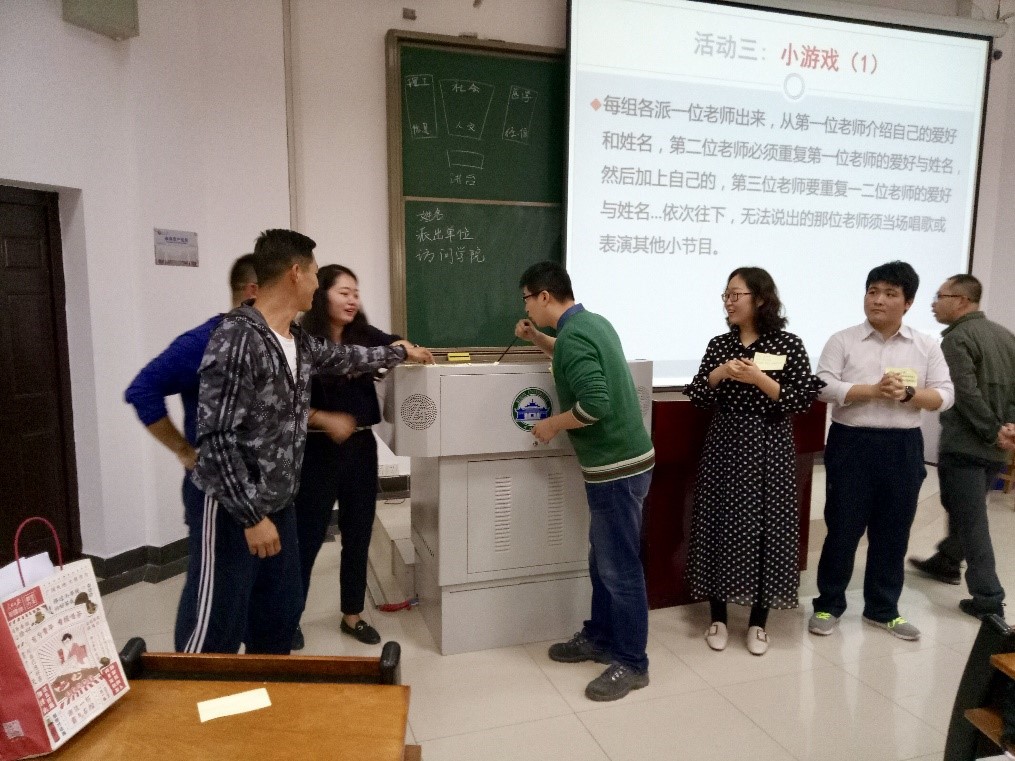 活动丰富多彩,互动性强,寓教于乐,分为三个阶段。第一阶段——“绝不自我介绍”,由班主任组织互不相识的访学进修老师彼此小声介绍认识,2分钟后,每位成员依次向大家介绍自己刚认识的访学老师。第二阶段的主题为“强中自有强中手”,访学老师按照访问学院重新分组,介绍自己的姓名、派出单位、访问学院、导师、感兴趣的研究领域、或目前参与的课题名称,交流科研工作或教学当中遇到的问题。许多同学院的老师们第一次认识了彼此,对访学领域与科研工作等问题展开了热烈的讨论。