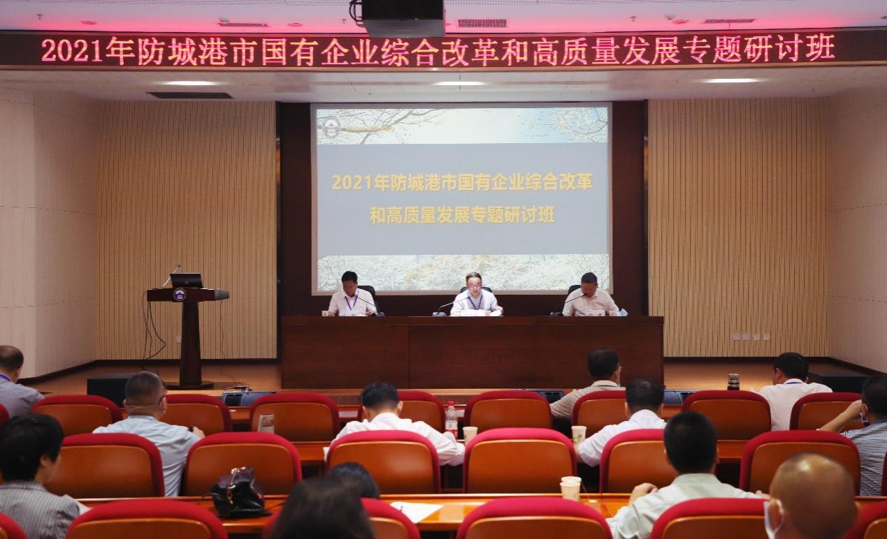 本次研讨班安排了中国在百年变局下的世界定位、地方平台公司运营与发展、国际国内双循环新格局解读、战略管理之公司治理与制度优化、提高人力管理效率等理论课程,结合党史学习教育开展学习研讨,交流《中国共产党简史》读书学习心得,就“如何推进国有经济布局、优化结构调整,增强防城港平台公司融资能力”进行了分组研讨。