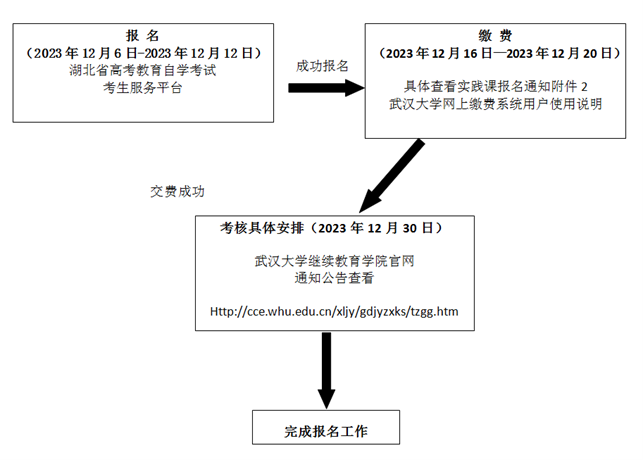 根据湖北省教育考试院鄂自考〔2020〕18号文件《省教育考试院关于调整行政管理、新闻学等部分面向社会开考专业主考学校的通知》精神(详见附件1),此后我校将不再举行高等教育自学考试面向社会开考专业实践考核。关于我校自学考试工作安排,2024年上半年自学考试实践考核课程报名于2023年12月6日开始报名,本次具体流程,请考生按以下要求做好报名与考核工作: