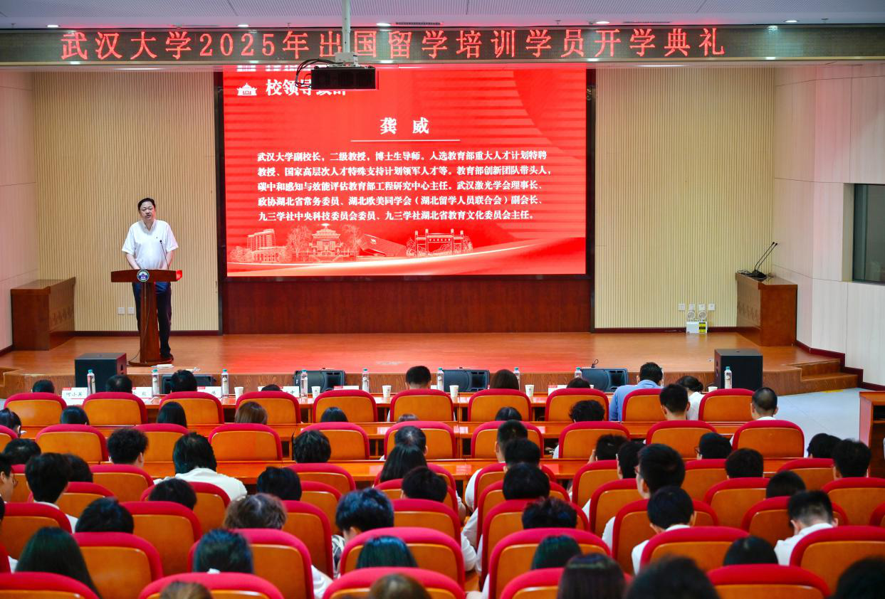 副校长龚威在讲话中向全体学员介绍了武汉大学的发展历程并提出三点期望,一是博学慎思,传承“武大精神”,在求学的道路上应主动思考、大胆质疑、严谨求证、厚积薄发,以“万卷书”的积淀,踏“万里路”的征程;二是植根中华,讲好“中国故事”,不论身在何处,都应自觉传承、弘扬中国优秀传统文化,以国际语言为媒介,让世界看到一个真实、立体、生动的中国;三是放眼全球,练就“世界眼光”,在求学的道路上,要学会将自己置身于全球语境之中,理解国际规则、关注全球性议题,努力成为胸怀天下、连接中外的国际化人才。
